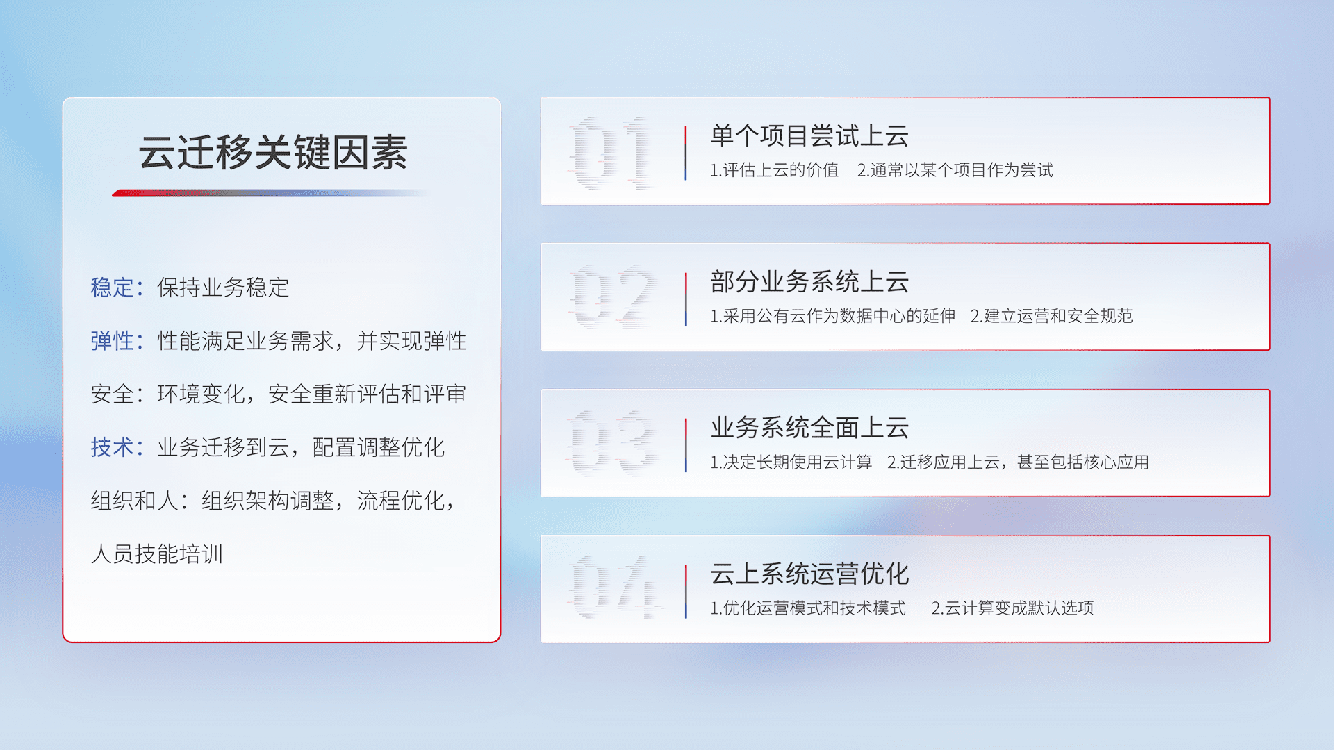 结合实际业务,,,,从规划设计、、、云平台选型、、、、云原生改造、、数据迁移、、、集成交付,,,迁移全过程为客户识别最佳上云路径,,做好风险识别管理,,,设计网络架构、、、身份权限、、安全审计合规、、操作审计、、、日志审计、、、监控告警策略、、多站点容灾设计等,,对云上基础设施进行整体规划,,,,提升IT治理水平,,,以满足弹性、、、、高可用、、、、高性能的需求。。。。