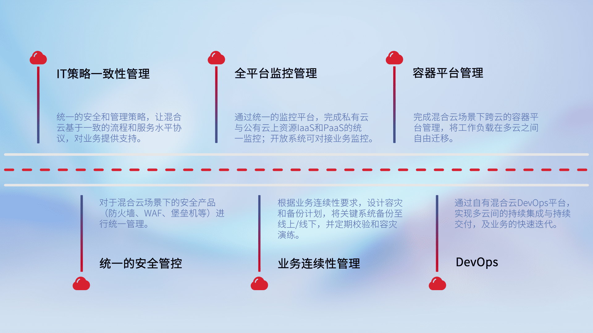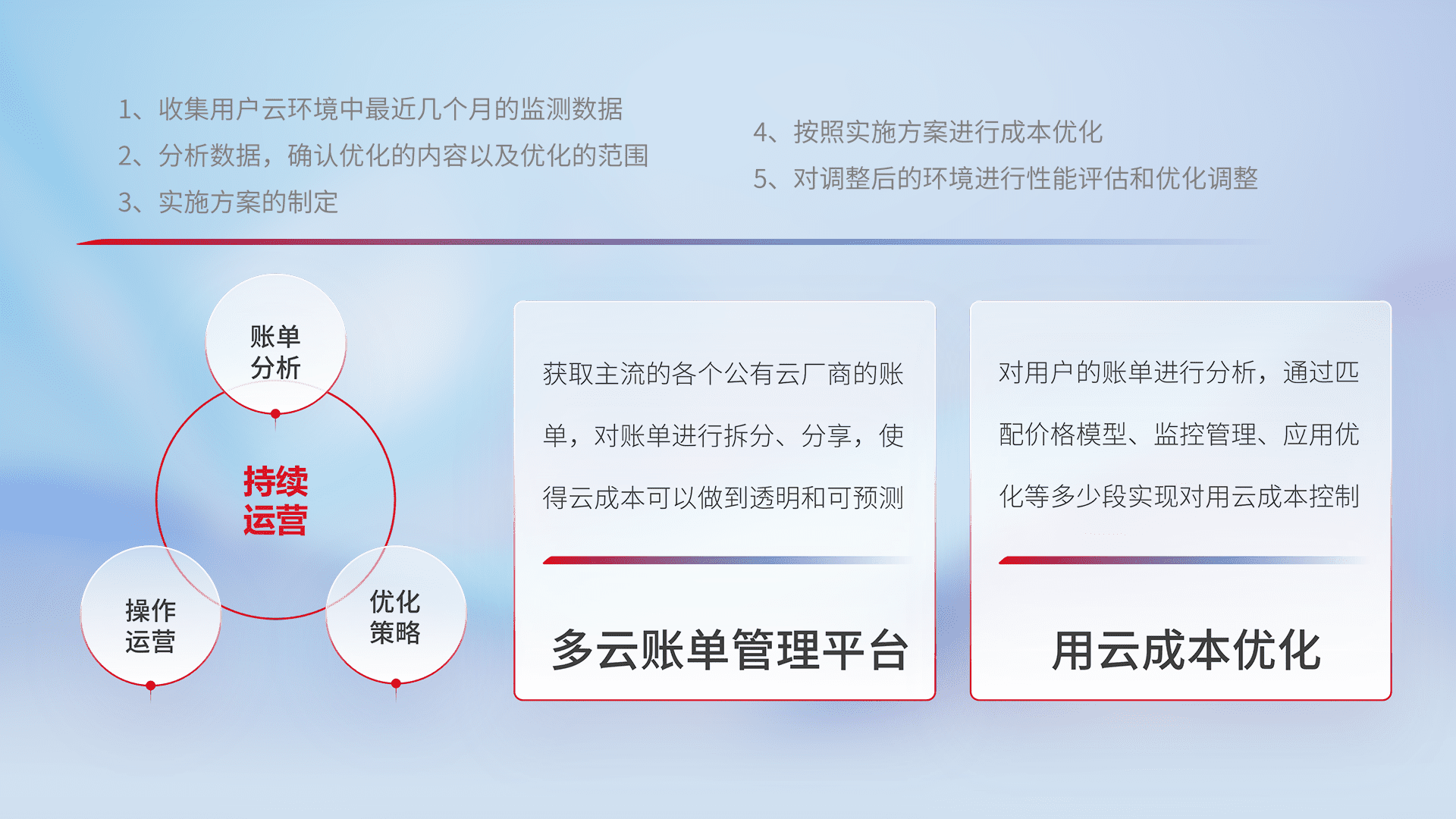 通过多云纳管,,,以统一的资源数据模型把客户的云资源进行抽象和封装,,进而实现对多云资源的统一操作,,,,保障云资源管理的可靠性、、稳定性与可用性。。量身定制化运维内容,,,配置、、开发运维、、补丁管理、、备份、、、、监控、、、认证和访问管理、、、审计和日常巡检等,,,,保障在用云过程中的可靠度,,,,稳定度以及高可用率。。。