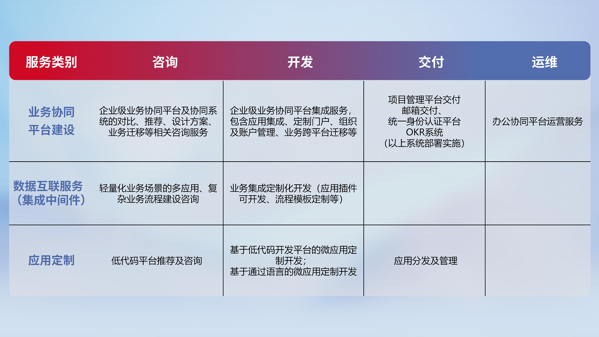 针对钉钉、、、企微、、、、IDaas等平台级产品提供产品的规划、、方案、、、交付、、定制化开发等服务,,,实现如统一协同办公、、、智能客户服务、、混合会议管理、、、、智能数据查询、、等业务场景,,,,实现数字化转型。。